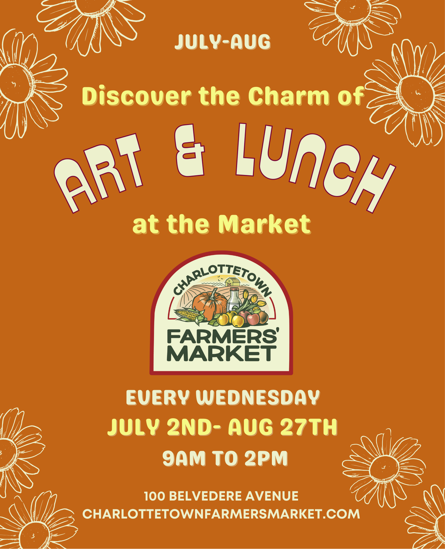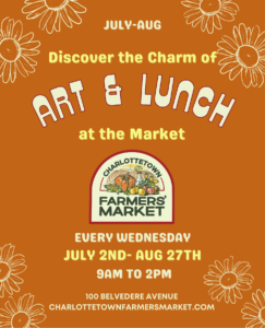 Cherchez-vous une activité amusante en milieu de semaine? Visitez le Marché fermier de Charlottetown pour ses objets d’art et sa cuisine avec Art and Lunch. Ce joyeux mélange d’artisans locaux, de restauration et de quelques fermiers se déroule dans une atmosphère détendue et accueillante. Découvrez des produits uniques faits à la main. Savourez les délices de chefs locaux. Prenez contact avec la communauté dynamique de Charlottetown. Rapportez un souvenir unique de l’Î.-P.-É. L’endroit idéal pour les visiteurs et la population locale. Venez profiter de l’île à son plein tous les mercredis de l’été!